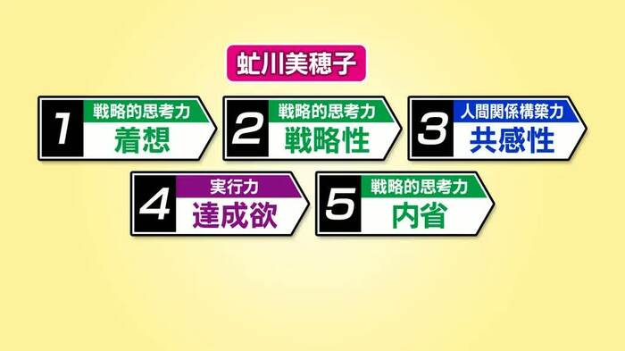 虻川さんは、「戦略的思考力」の中の「着想」と「戦略性」が1位と2位となり、ゴールに辿り着くための選択肢をいくつも考え、最短ルートを見つけることができるのが「強み」だという結果が出ました。