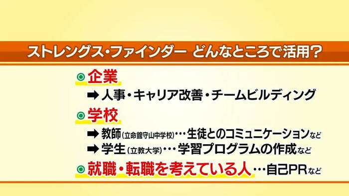 「ストレングス・ファインダー」は、企業のチームビルディングや学校の教師の研修、就職・転職活動などに活用されているそうで、番組では取り入れている企業や学校を取材しました。