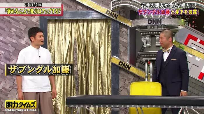 さらに、“大物”から褒められたことで漫才の能力がアップしたのかを検証するため、岩井さんの代役として登場した、ザブングル加藤さんと即興漫才に挑戦。