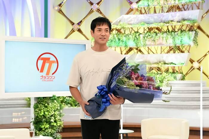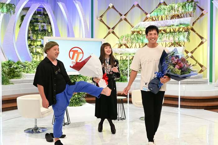 そして、若村さんがあいさつをしようとすると、夫役を務めたマキタスポーツさんが大きな花束を持ってサプライズ登場!