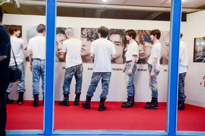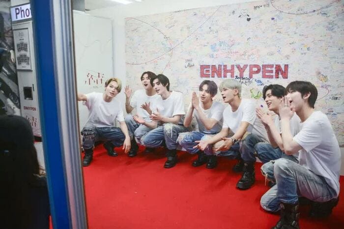 超満員のステージでの「めざましライブ」を終えて、アーティストブースに向かった、ENHYPEN(JUNGWON、HEESEUNG、JAY、JAKE、SUNGHOON、SUNOO、NI-KI)の7人。