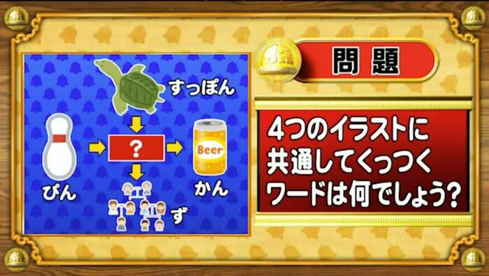 最初は「脳ミングアップクイズ」から、くっつきワードの問題。次の4つのイラストに共通してくっつくワードを答えてください。