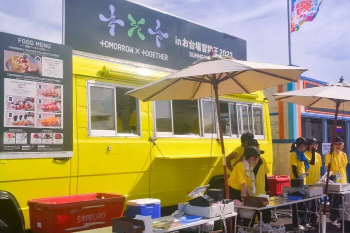 鮮やかな黄色のキッチンカーからは、トレンドの韓国グルメや、コラボメニューも。購入者には商品ごとに設定されたお台場冒険王限定ノベルティがプレゼントされます。