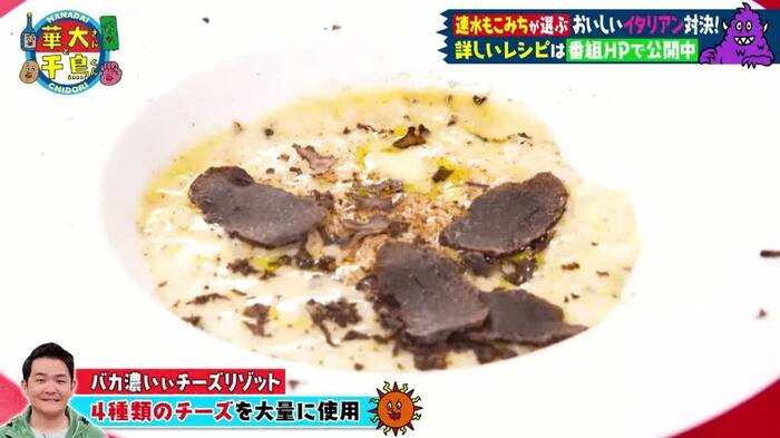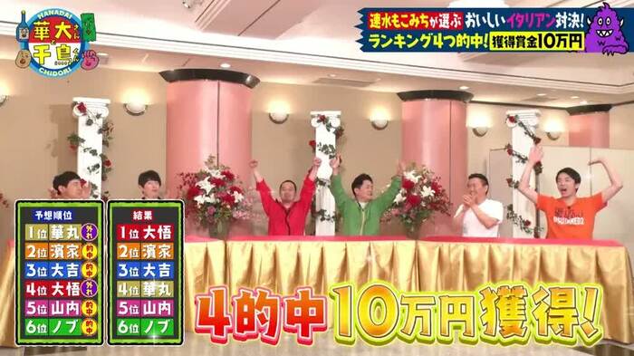 博多華丸さん、博多大吉さん、千鳥(大悟さん、ノブさん)、かまいたち(山内健司さん、濱家隆一さん)が、オリジナルイタリアンを作り、速水さんがおいしかった順にランキングをつけます。