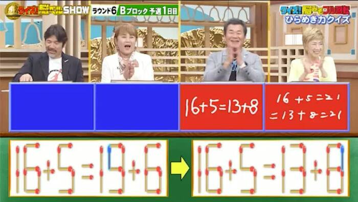 正解は、まず、右の式の「9」から1本を動かし「13」にします。その1本を右の式の「6」に足して「8」にします。そうすれば「16+5=13+8」となります。フッキーさん、瀬川さんが正解!