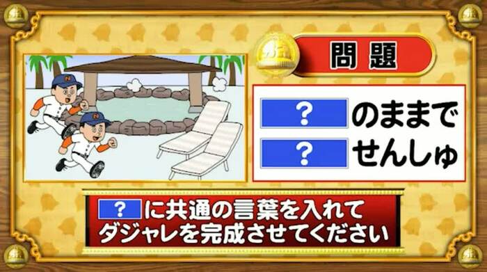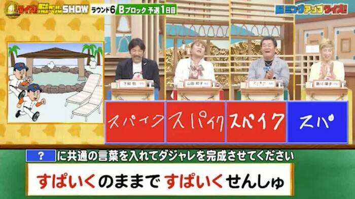 正解は「すぱいく(スパイクのままでスパ行く選手)」。下柳さん、山田さん、フッキーさんが正解。