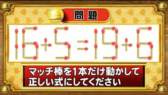 次は、マッチ棒問題。次の式のマッチ棒を1本だけ動かして正しい式にしてください。