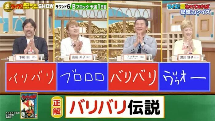 今回の解答者は、元プロ野球選手・下柳剛さん(55)、お笑いタレント・山田邦子さん(62)、ものまねタレント・フッキーさん(56)、演歌歌手・瀬川瑛子さん(75)の4名です。