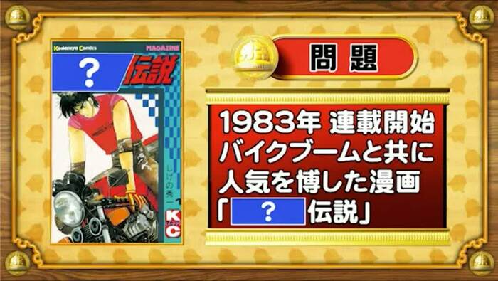 最後は、なつかし漫画の問題。今から40年前の1983年に連載が開始され、バイクブームと共に人気を博した漫画『[?]伝説』。「?」に入る言葉は何でしょう?