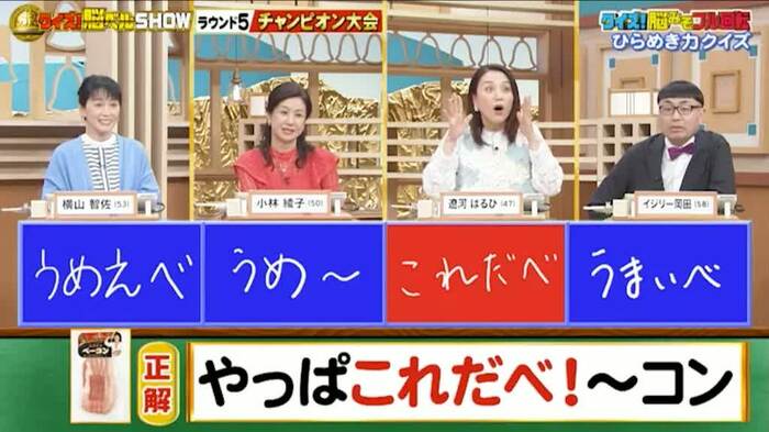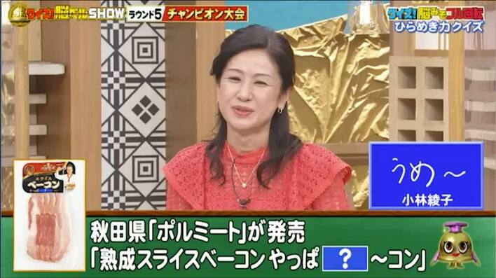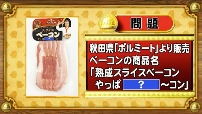 最初は、おもしろ商品名のクイズ。秋田県のメーカーから販売されているベーコンの新商品名「熟成スライスベーコン やっぱ[?]〜コン」、「?」に入る言葉は何でしょうか?
