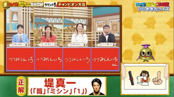 正解は「堤真一(『筒』『ミシン』『1』)」。見事に全員正解です!
