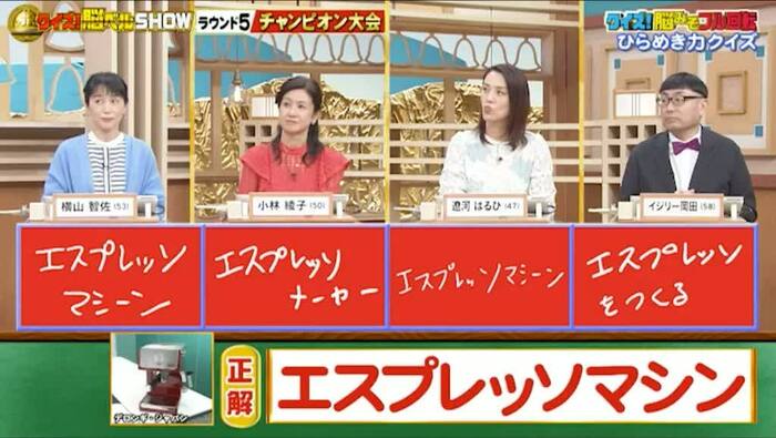 今回の解答者は、声優・横山智佐さん(53)、女優・小林綾子さん(50)、タレント・遼河はるひさん(47)、お笑い芸人・イジリー岡田さん(58)の4名です。