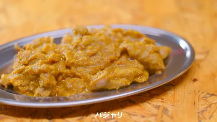 ガヤさん:2品目の「バジャリ」は、「Vajri Masala」という料理です。通常は羊かヤギのモツを使うのですが、東京では手に入らないので今は豚のモツを使っています。モツで作るカレーや炒め物は全て「Vajri」と言います。オニオンガーリックマサラというスパイスミックスを使っていて、オニオンとガーリックの味が目立つピリ辛料理です。