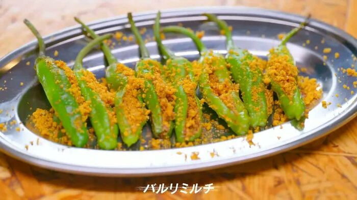 ガヤさん:バルリミルチは基本的にピーナッツの粉に色々なスパイスやゴマを混ぜて、それをしし唐や唐辛子の中に入れて軽く炒めるという料理です。西インドのマハラシュトラ州で使われているゴーダマサラというスパイスや、クミン、コリアンダーを使っています。少しピリ辛にしたいのでチリパウダーも入れています。