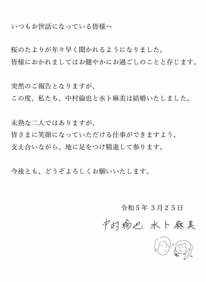 「柄にもなく、少し形式ばった報告となり恥ずかしいのですが」と前置きしつつ、「この度、わたくし中村倫也は、水卜麻美さんと結婚いたしました。生活に彩りと安心をもたらしてくれる、春風のような方です」と綴っています。