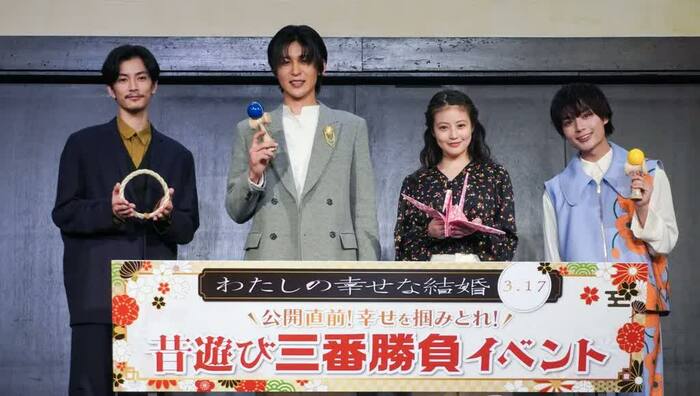 2月27日、目黒蓮さん(Snow Man)が主演を務める映画「わたしの幸せな結婚」の公開直前イベントが行われ、目黒さん、今田美桜さん、渡邊圭祐さん、大西流星さん(なにわ男子)が登壇しました。