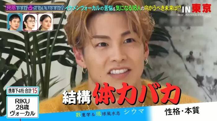 2月13日(月)放送の『突然ですが占ってもいいですか?』(フジテレビ)は、THE RAMPAGE from EXILE TRIBEのボーカルである、RIKUさん、川村さん、吉野北人さんが、シウマさんに占われました。