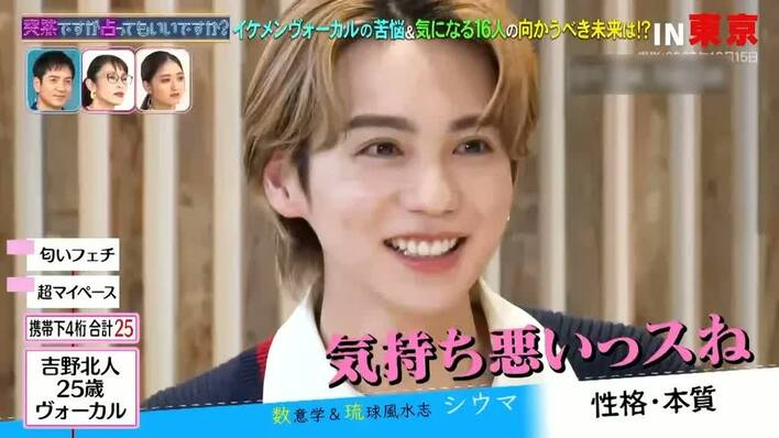 吉野さん(携帯電話の下4桁の合計数「25」)は、シウマさんから「しっかり考えて行動する。逆算が上手だけれど、超マイペース」と鑑定が。RIKUさんは「会話で独特の間があると、『これは北ちゃんタイムね』と思ったりする」のだそう。