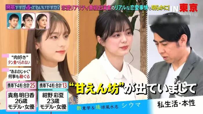 一方の貴島さんは、「事務所に入ったのが16歳のとき。当時、お付き合いしていた方にフラれて『絶対に見返してやろう』と思って、レッスンを頑張った」と、失恋を告白。その後、シウマさんは、貴島さんの恋愛遍歴を次々と言い当て、貴島さんも紺野さんも驚愕しました。