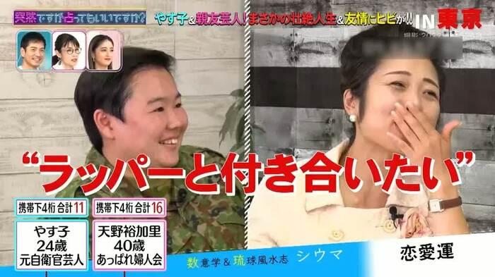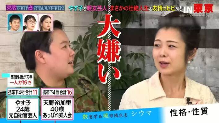 シウマさんが、やす子さん(携帯電話の下4桁の合計数「11」)について「素直で天然気質。集団生活が苦手で、1人が好き」と鑑定すると、やす子さんは「スタジオよりも、1人でロケをするほうが好き」と、占い的中に驚きました。