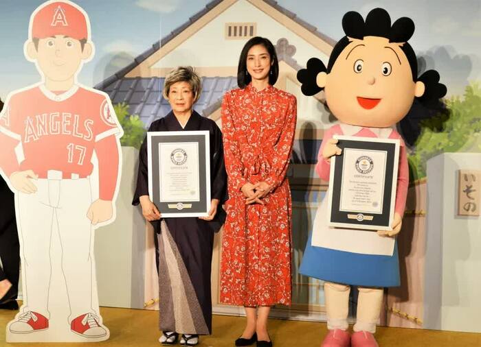 去る11月17日(日)、お台場の湾岸スタジオにて、フジテレビの人気アニメ『サザエさん』の放送50周年を祝した会見が行われ、サザエの声を務める声優の加藤みどり、24日(日)に実写版としてスペシャルドラマが放送され、サザエを演じる天海祐希、そしてサザエさん(着ぐるみ)が登壇した。