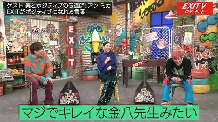 アン ミカさんのEXIT評は止まらず、「クラスで1軍の目立つグループにおるけど、女の子とも、2軍・3軍の子らともしゃべってくれる、なんかいいやつ」と続け、「あなたたち得よねぇ~!」と笑顔を向けました。