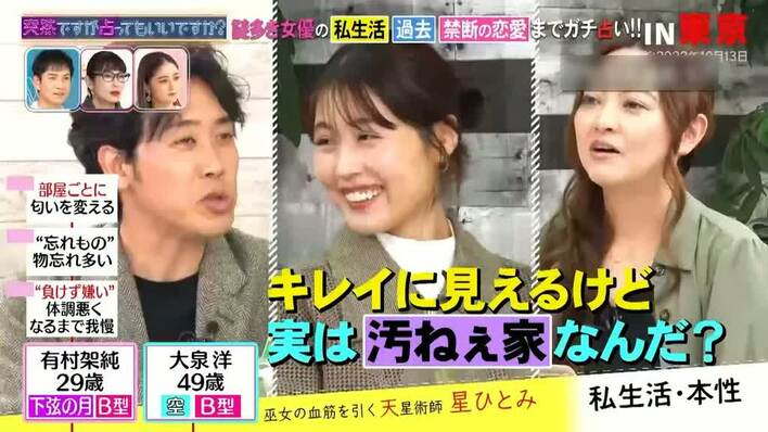 星さんは、有村さんには「ちょっとガサツな星」が入っており、掃除はきちんとするものの、テーブルの角に汚れが残っていたりすると占い。それを聞いた大泉さんは「実は汚ねぇ家なんだ?」とイジり、大笑いました。