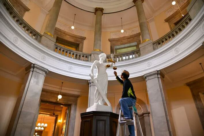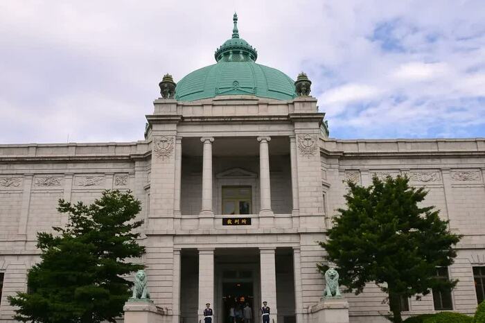 クラシカルな建物に、司法・裁判の公平さを表すシンボルである正義の女神・テミス像を置くだけで、そこは立派な裁判所。