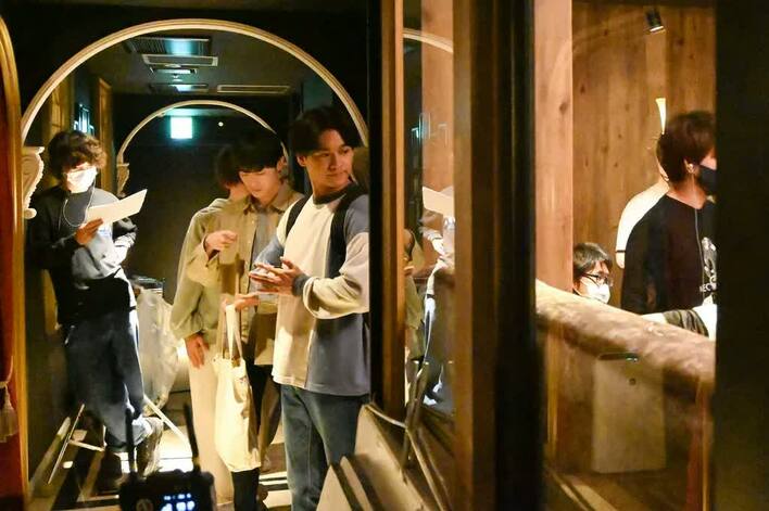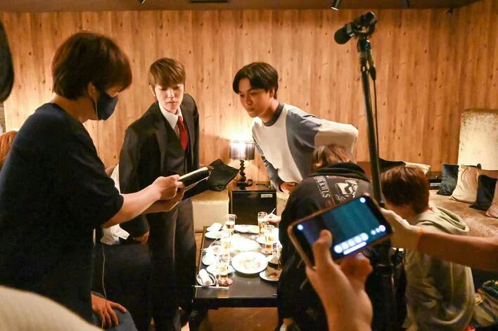この日は朝から、蘇芳(すおう/七海)、藤(ふじ/瀬戸かずや)、琥珀(こはく/如月蓮)ら“男装女子”と、常盤(ときわ/井上)、浅葱(あさぎ/小西詠斗)、萩(はぎ/増子敦貴)ら男子大学生たちが、合コンで初対面するシーンが撮影されていました。