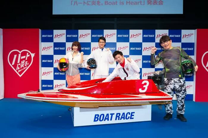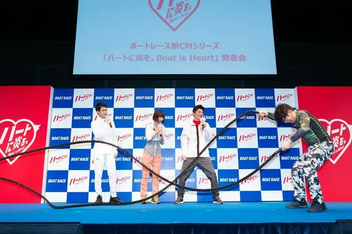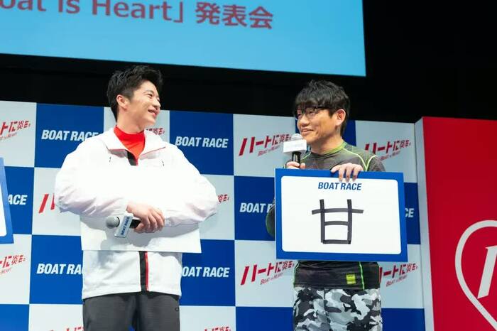 CMは、脱サラしたボートレーサーの“田中くん”が成長していく姿を描くCMの第2弾。田中に加え、武田、葉山、飯尾が新たにボートレーサーとして登場する。「飯尾さんのアドリブギャグがばっちり使われているのが面白かったです!」と、CMの感想を田中が語ると、飯尾も「勇気のある編集ありがとうございます!と、笑顔を見せた。