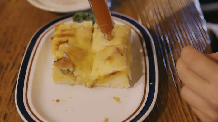 このピザトーストは何より“厚さ”が魅力!純平も「パン分厚いのにフワフワだ〜!」と絶賛。フワフワのパンととろけるチーズの絶品コラボをじっくり味わえばペロッと食べきれてしまうが、彼のように途中でタバスコをかけて味の変化を楽しむもよし。