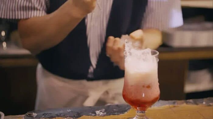 さぼうるの人気メニューは、劇中でもほとんどの客がこぞって注文している、カラフルなクリームソーダ。しかし、純平は「“フレッシュ”なアイディアが浮かぶかも」と期待を込めて、いちごのフレッシュジュース(600円)を注文する。