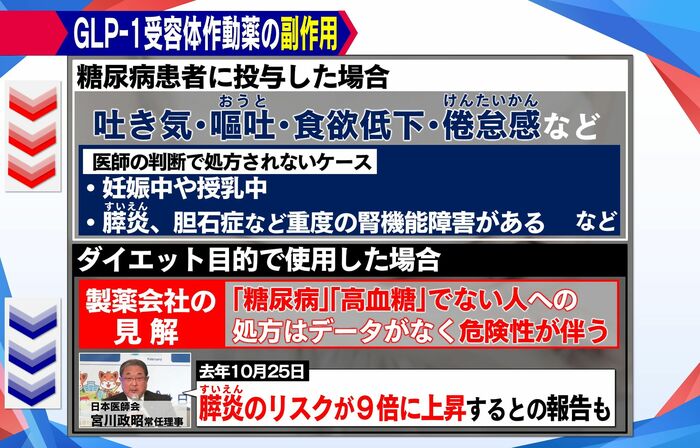 糖尿病の患者さんが使う分には使いやすいお薬ではあるのですが、日本医師会の研究で示されているすい炎のリスクについても、0.1%未満と言われているのですが、あくまでもそれは安全性を検証された対象者であって、検証がなされていない方々が乱用すると、想定していないリスクが出る可能性もありますので、そこが危険なのかなと。