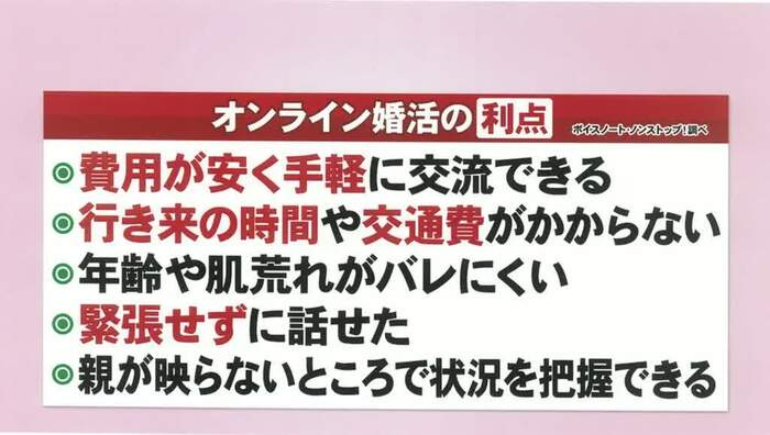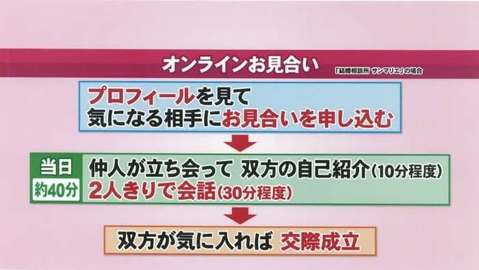 番組では、複数の男女が参加する“オンライン婚活”の様子を取材。その会では、参加者全員でトークした後、1対1で話す時間も設けているという。また、“オンラインお見合い”に参加した女性によると、釣書をじっくり読んで選んだ相手と、約30分間、1対1で話せるので、直接会うのと変わらないという印象を持ったそうだ。