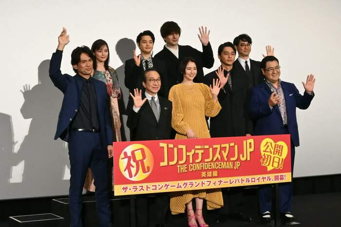 1月14日、「コンフィデンスマンJP 英雄編」の初日舞台挨拶が行われ、長澤まさみ、東出昌大、小日向文世、小手伸也、瀬戸康史、城田優、生田絵梨花、江口洋介、田中亮監督が登壇した。