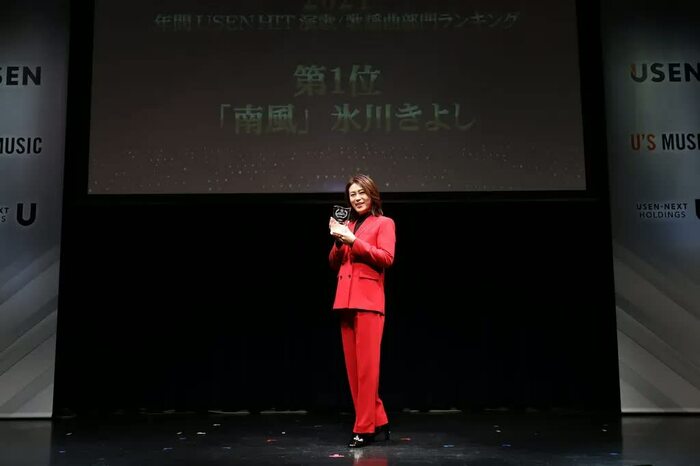 12月10日(金)、株式会社USENが創業60周年を記念して、「USEN MUSIC AWARD 2021」を開催。歌手・氷川きよしがシングル曲「南風」で、「2021 年間 USEN HIT 演歌/歌謡曲ランキング 1位」を獲得し、全身真っ赤なスーツで授賞式に登壇した。