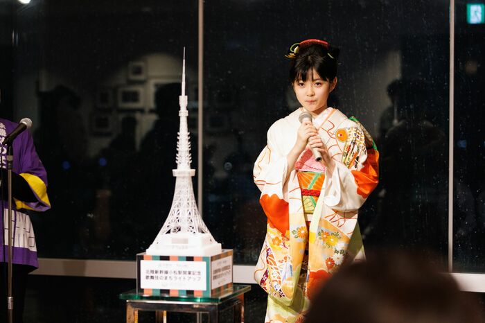 3月16日の北陸新幹線小松駅開業を記念した今回のイベントでは、MCの山崎怜奈さんによる「点灯!」の掛け声に合わせて、ぼたんさんが東京タワーの形を模したスイッチを押すと、会場の背後にそびえる東京タワーが点灯。