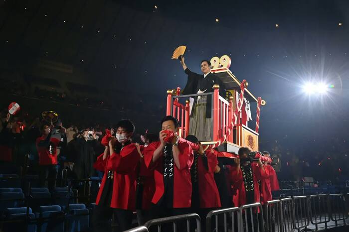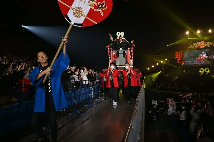北島三郎の「まつり」が流れる中、はかま姿で扇子を持った岡村は、会場に来たファンに手を振りながら会場を一周し、メインステージに到着。