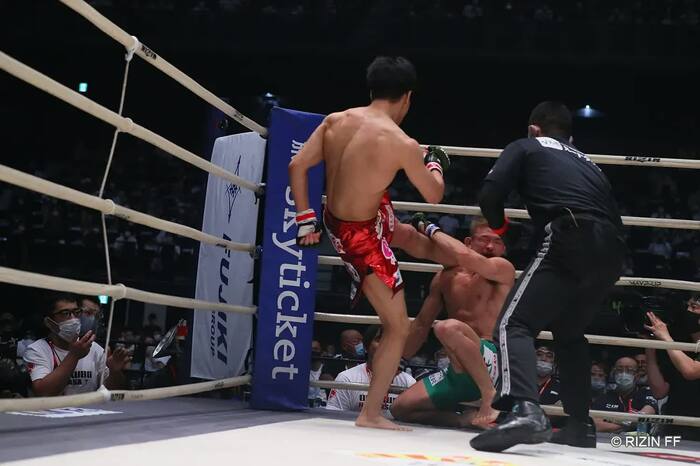 そして、さらに右アッパーから跳びヒザを入れると、扇久保選手が倒れ、そのままパウンドやサッカーボールキックなどで攻め込み、レフェリーがここでストップをかけた。