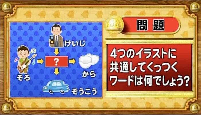 改めて第1問。くっつきワードの問題。次の4つのイラストに共通してくっつくワードは何でしょう?
