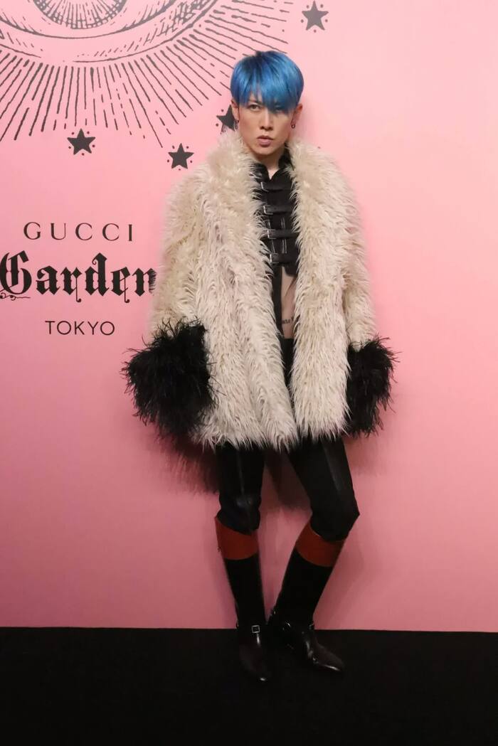 MIYAVIは、ベージュのファージャケットに黒のパンツ、ロングブーツを合わせた、ステージ衣装のようなコーディネートで登場。