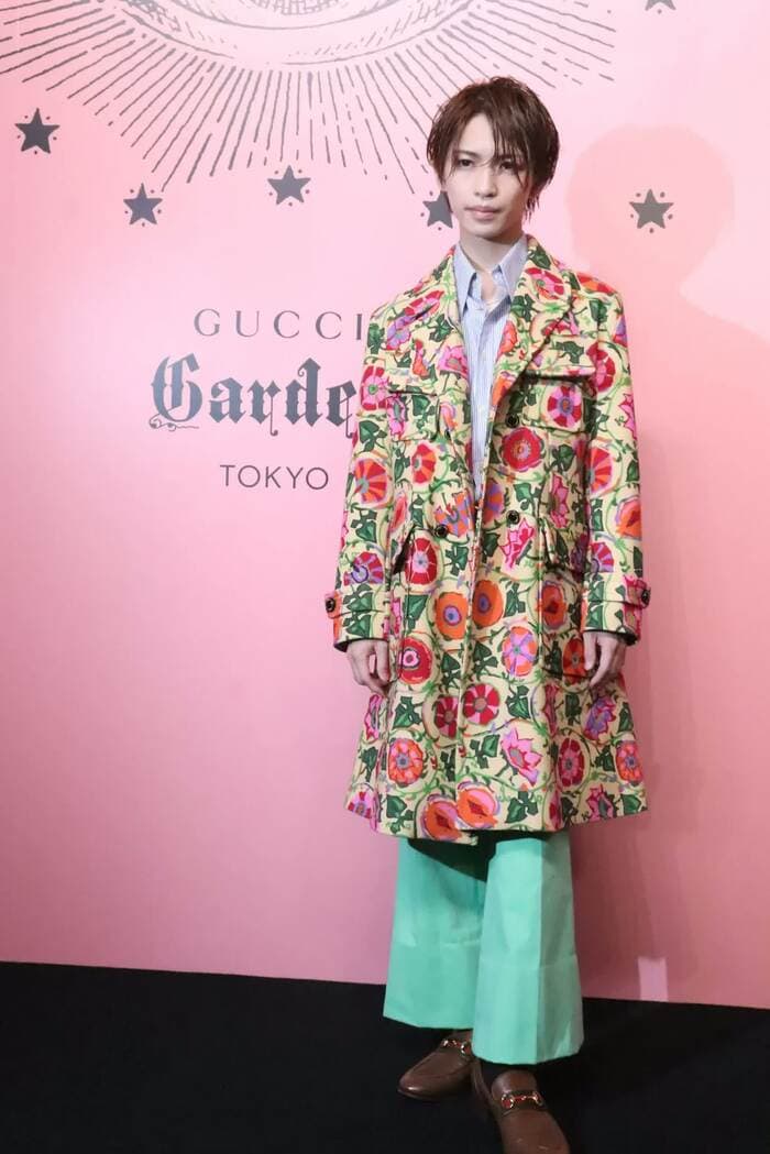 衣装のポイントを聞かれると、「グッチ、アリアンの衣装を着させてもらいました」と言い、「(展示会の空間に)溶け込めるキャラクターになったと思います」と凛々しい表情。