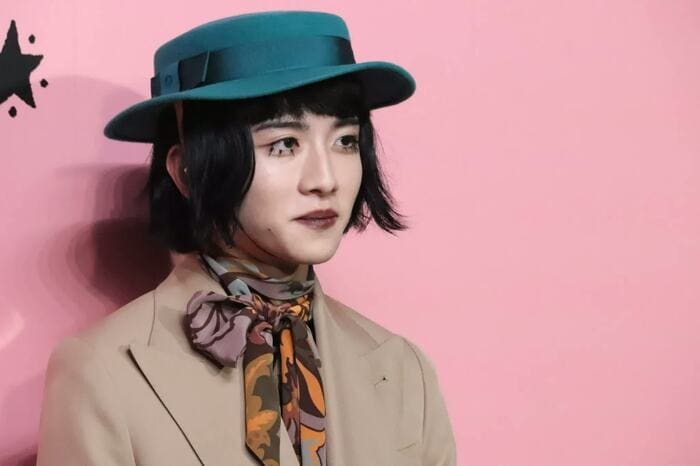 淡いイエローベースに赤とオレンジの花が描かれた華やかなロングジャケットに、水色のストライプ柄のシャツと、エメラルドグリーンのワイドパンツ、茶色のローファーを合わせたカラフルなコーディネートを披露。