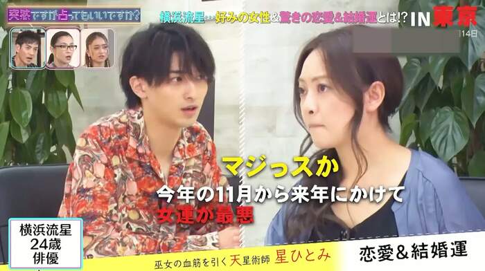 10月21日(水)、フジテレビでは『突然ですが占ってもいいですか?』が放送され、横浜流星が星ひとみによる占いを受けた。