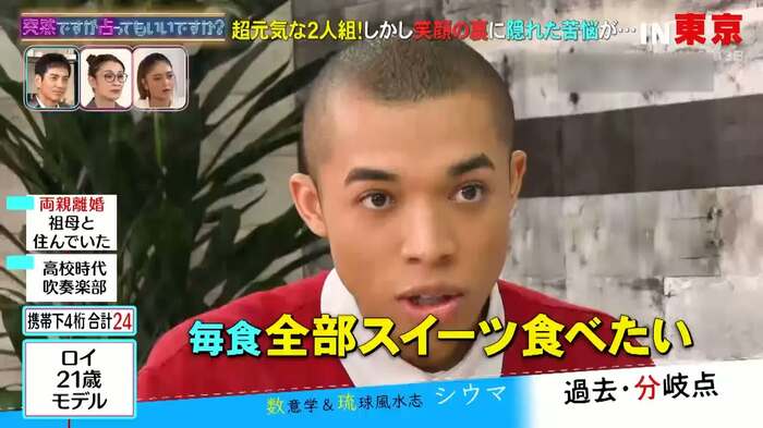 うれしそうなリアクションを見せながら、「3億円貯めて、毎食スイーツ食べたいんですよ」というロイ。シウマは「(ロイが持つ数字の)『24』は、食後のスイーツを食べると運気が上がりますし、金運にいちばん強い数字なんですよ。なので、“毎食スイーツ”をやってたほうが、逆に運気が上がっていきます」と診断していた。