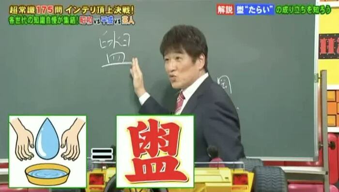 「たらい」を漢字で書く問題では、現代文担当の林修先生が文字の成り立ちを教えてくれた。これを覚えておけば、「たらい=盥」という文字が簡単に書けるようになるという。