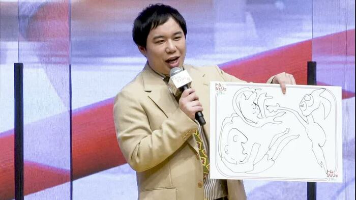 最後に、トムとジェリーが登場し、3人を映画の応援団として任命。たすきを渡すも、上手くかけられない粗品にジェリーが手を貸すなど、微笑ましいやりとりが見られた。