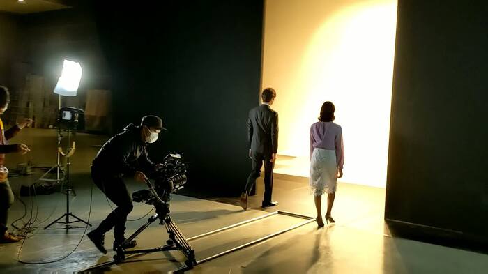 その後、スポット映像用に2人が並んで歩く様子を収録。顔は見合わず、お互いの空気感でピッタリと歩き出しを合わせる2人の姿から、コンビネーションの良さが伝わってくる。その場で収録した映像を確認すると、2人が白い空間に吸い込まれていくように見え、「こんな感じになるんだ!」と、永島アナが驚きの声をあげていた。