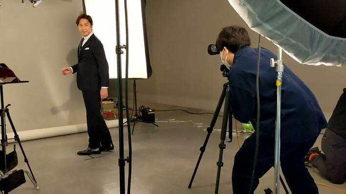 取材班がスタジオに入ると、これから撮影、収録するポスターやスポットに関する説明をスタッフから受けていた谷原と永島アナ。簡単にイメージなどが伝えられると、さっそく谷原からポスターの撮影がスタートした。