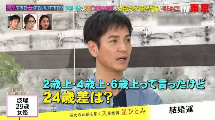 すかさず「24歳差は?」と自分と波瑠の結婚相性を聞く沢村だったが、星から「論外かな」とあっさり返されてしまっていた。